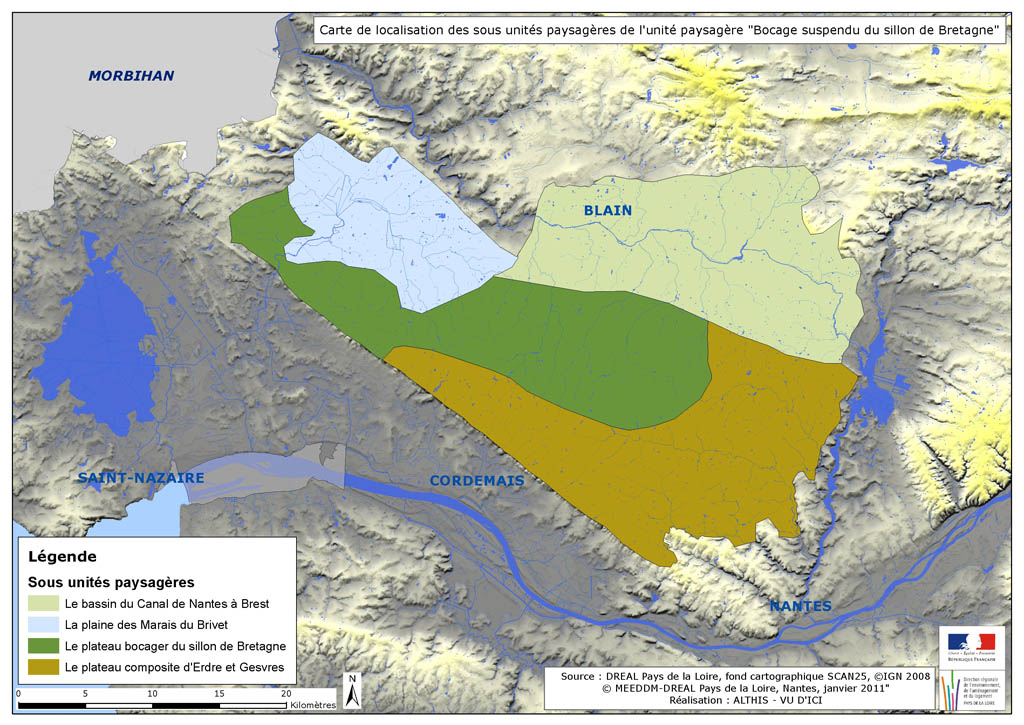 Cette sous-unité est assez originale dans sa configuration dans la mesure où elle constitue un espace de marais plan enclavé dans le plateau. Véritable château d'eau du Brivet, ce paysage se distingue par son horizontalité et son maillage de fossés et canaux important qui structure l'espace. Le frêne prend une part dominante dans les haies et l'absence de sous strate arbustive crée parfois des effets de transparence qui donnent de la profondeur au paysage. Quelques rideaux de peupliers se distinguent de manière un peu plus marquante. C'est peut-être en hiver quand la plaine s'inonde que ce paysage est le plus spectaculaire: le réseau bocager est comme décuplé par son reflet qui quadrille des parcelles de ciel. Comme dans les unités de marais, la relation entre les sièges d'exploitation sur les franges de la plaine inondable et les prairies humides est primordial dans le maintien de l'équilibre de ce paysage.