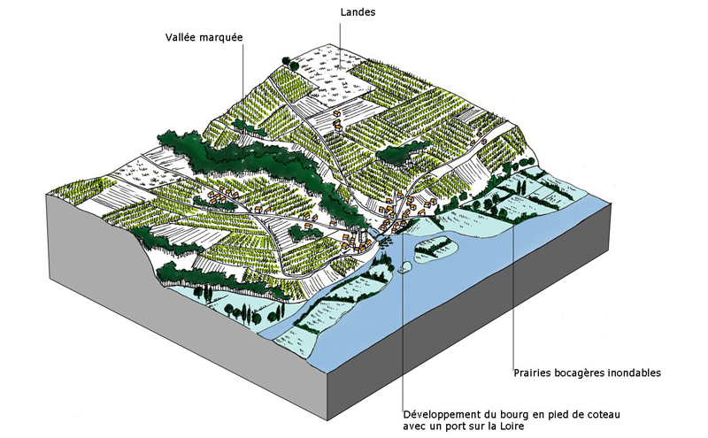 La carte de Cassini montre l'orientation privilégiée du domaine viticole sur les coteaux nord de la Loire. Le dessin des coteaux souligne l'importance du réseau hydrographique et des zones humides : marais, prés pâturés. La structure géométrique du domaine de la Guere apparaît clairement.